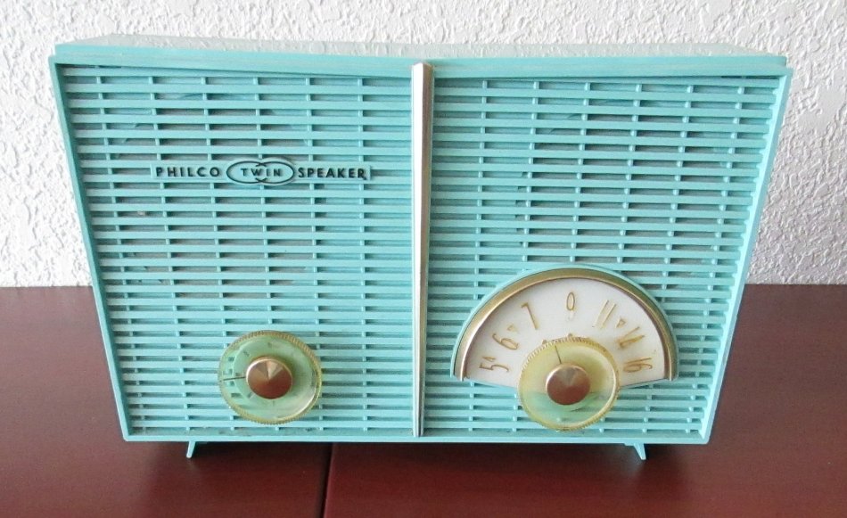 Philco twin—speaker radio with aqua plastic housing